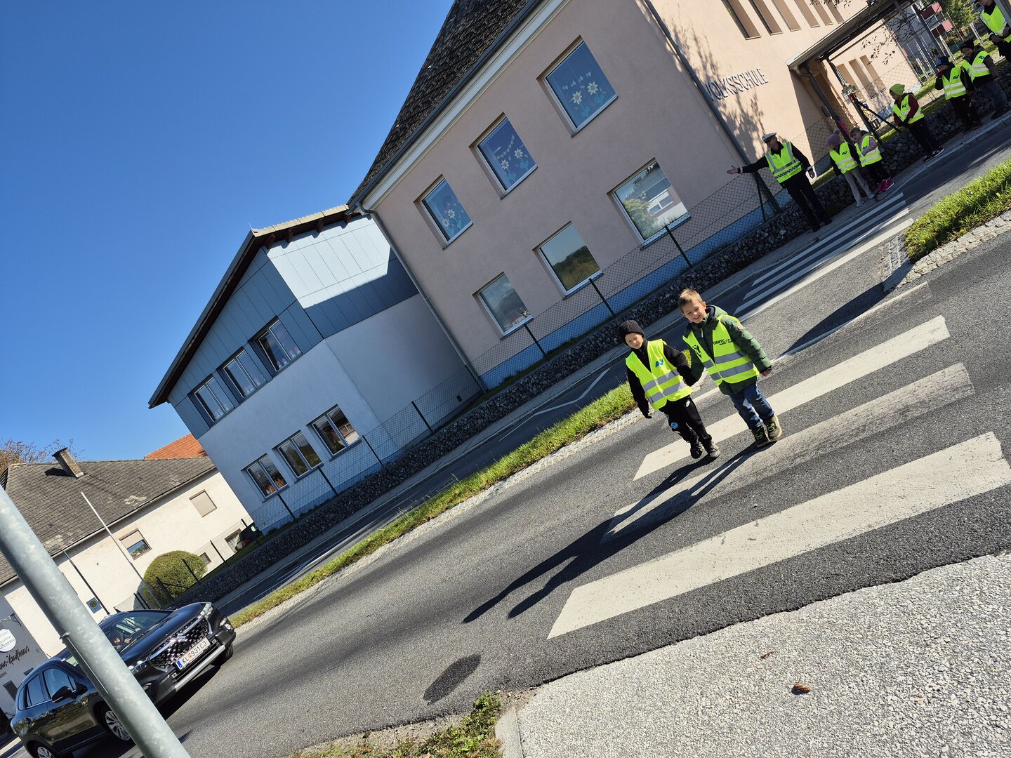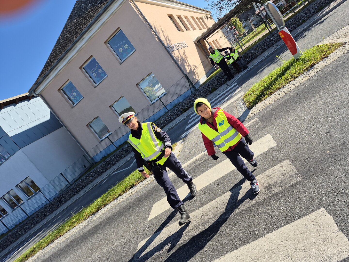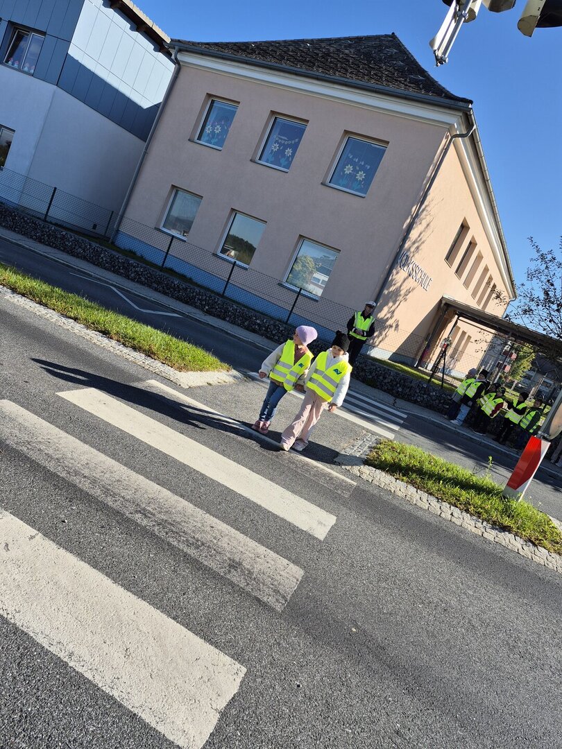 1 a Im Rahmen der Verkehrs- und Mobilitätserziehung hatten wir Besuch der Polizei. Es wurden uns wichtige Regeln und Verhaltensweisen im Straßenverkehr wie das sichere Überqueren des Zebrastreifens erklärt.