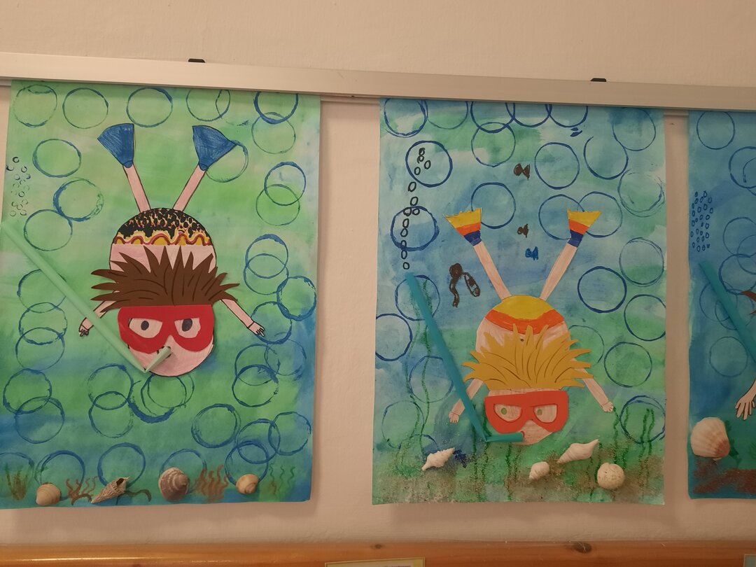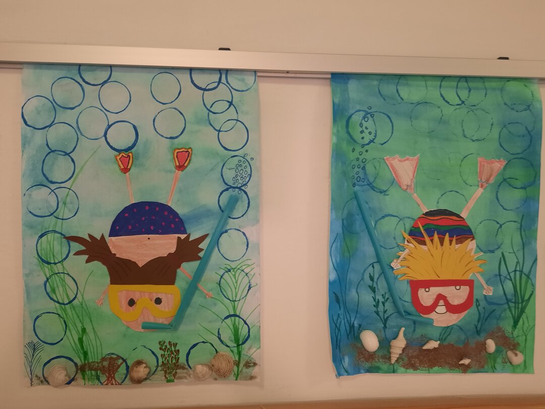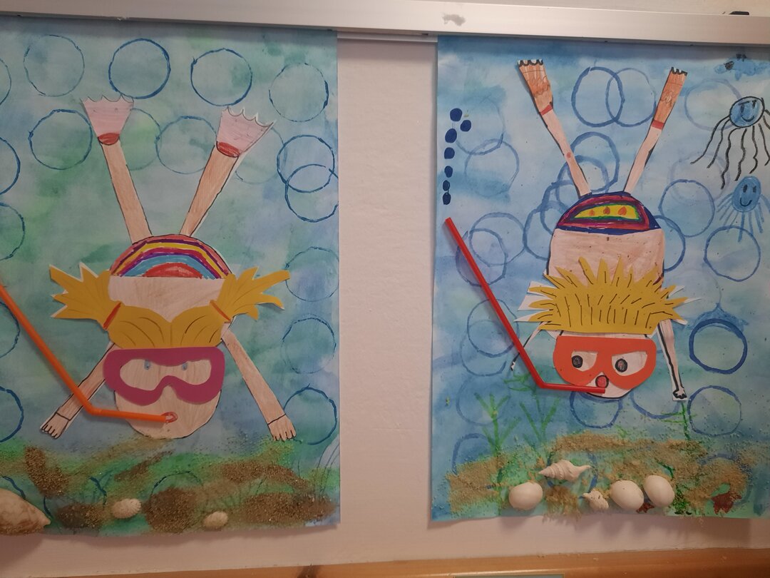 Was lag näher, als sich in der Vorfreude auf die Ferien mit Badespaß und Tauchen zu beschäftigen. Mit Geduld, Liebe zum Detail und ganz vielen interessanten Urlaubsmitbringseln wie Muscheln, Steinen und Sand, wurden farbenfrohe Bilder gestaltet. Nun verschönern sie unsere Galerie vor den Klassen, als großartiger Auftakt zu den Ferien!