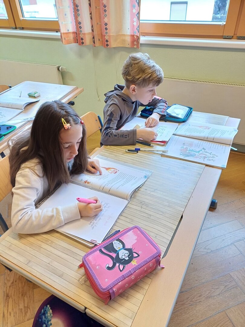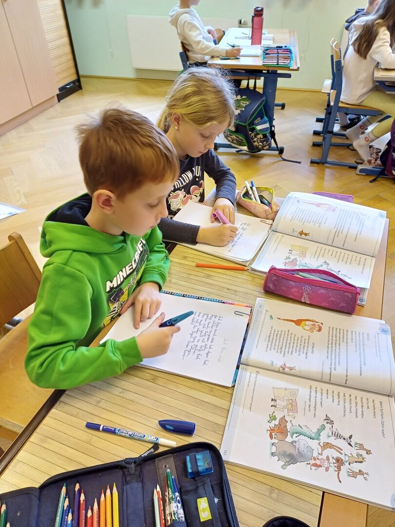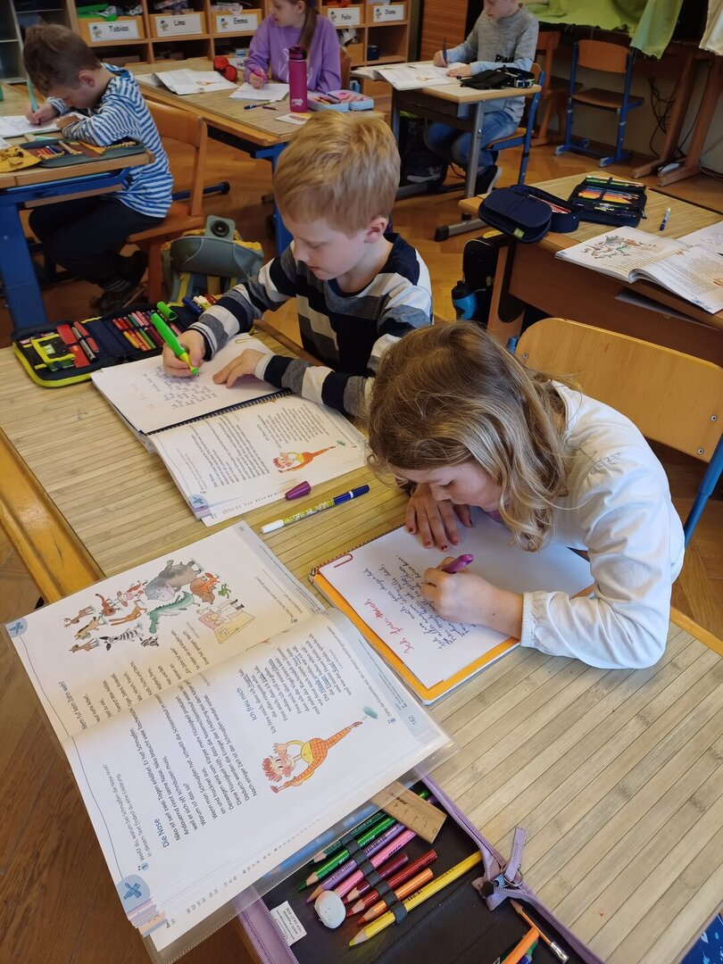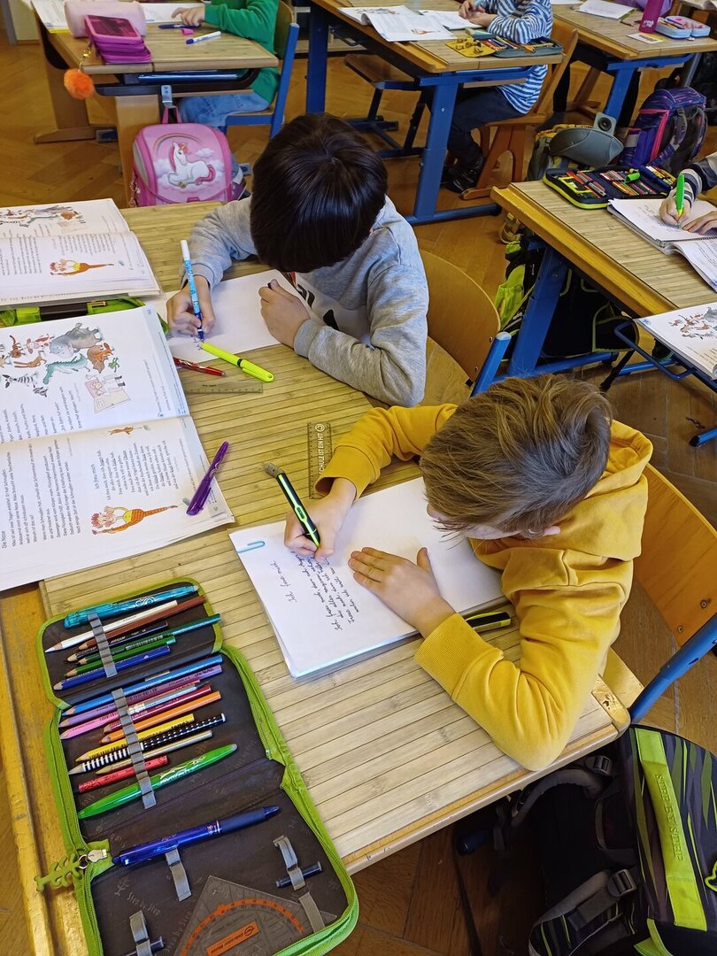 Die Kinder der 2a konnten es kaum erwarten ihre neuen Füllfedern in Gebrauch zu nehmen. Auch die Arbeit mit einem ,,Faulenzer" war für alle eine neue Erfahrung und deshalb hat sich jeder bemüht das Gedicht in schönster Schreibschrift zu Papier zu bringen.