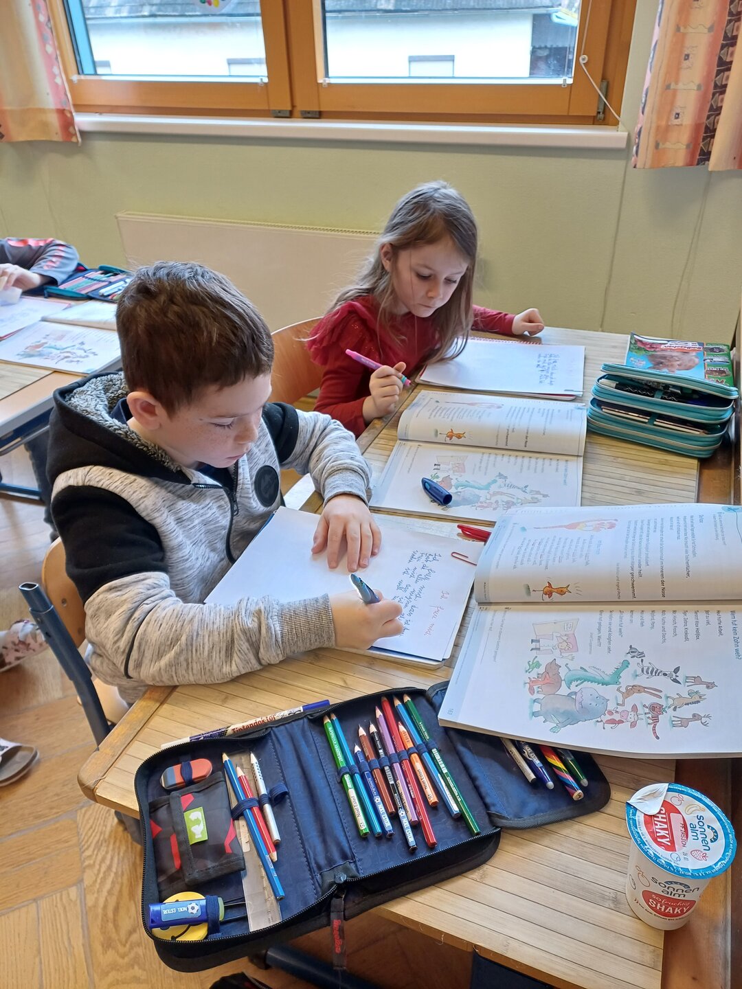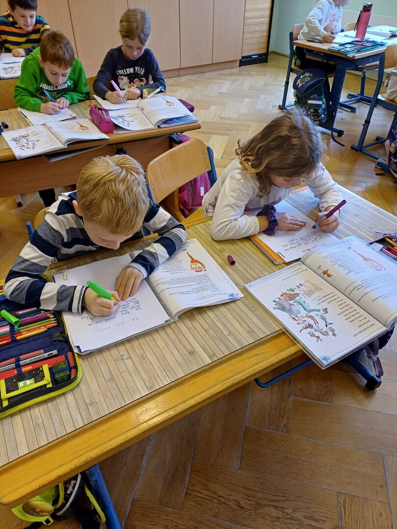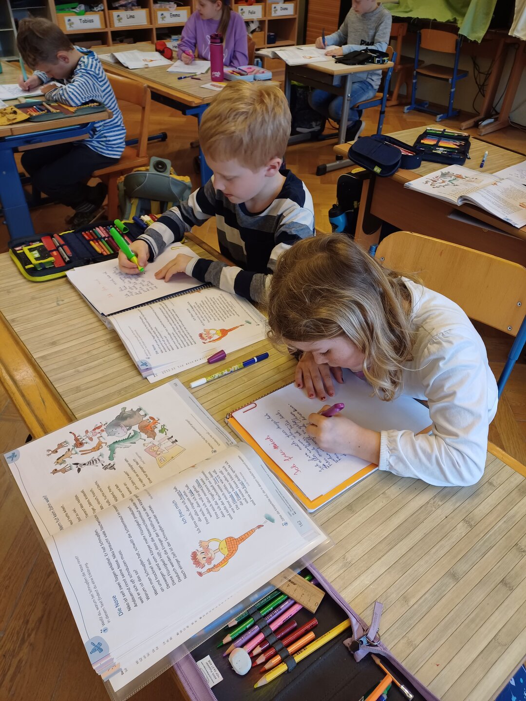 Die Kinder der 2a konnten es kaum erwarten ihre neuen Füllfedern in Gebrauch zu nehmen. Auch die Arbeit mit einem ,,Faulenzer" war für alle eine neue Erfahrung und deshalb hat sich jeder bemüht das Gedicht in schönster Schreibschrift zu Papier zu bringen.