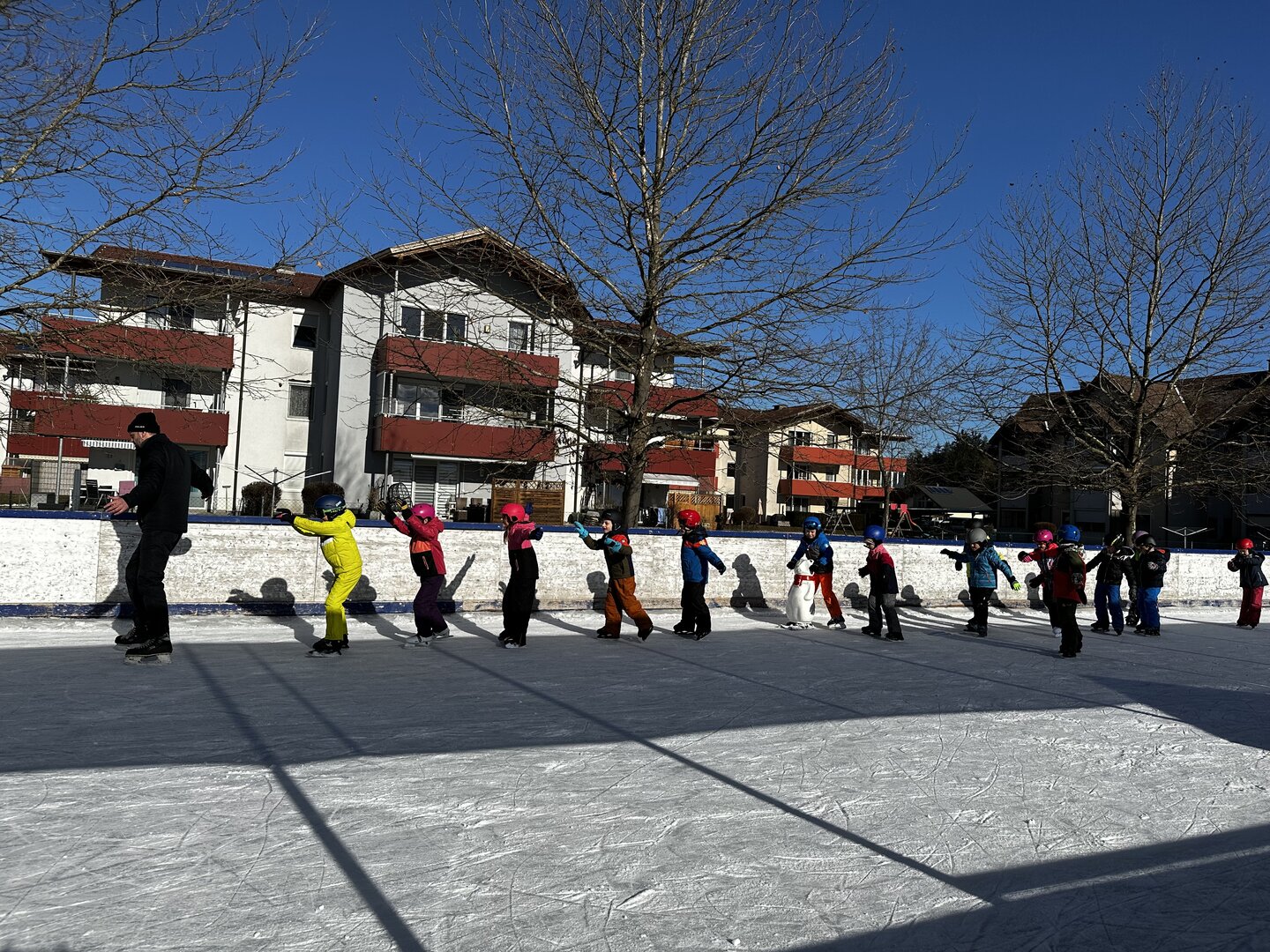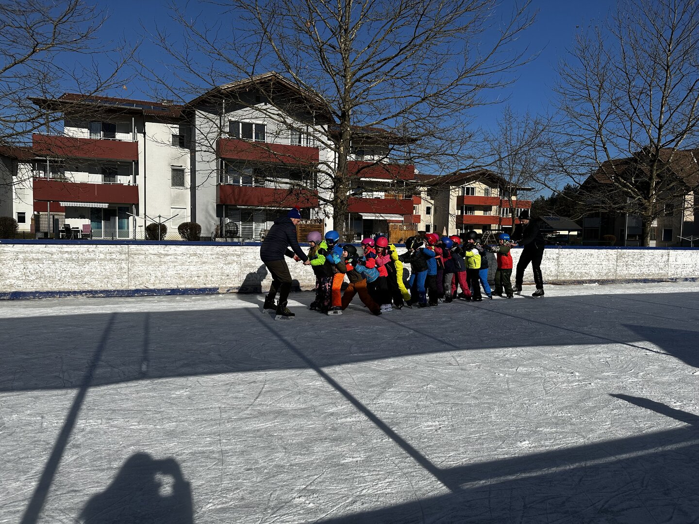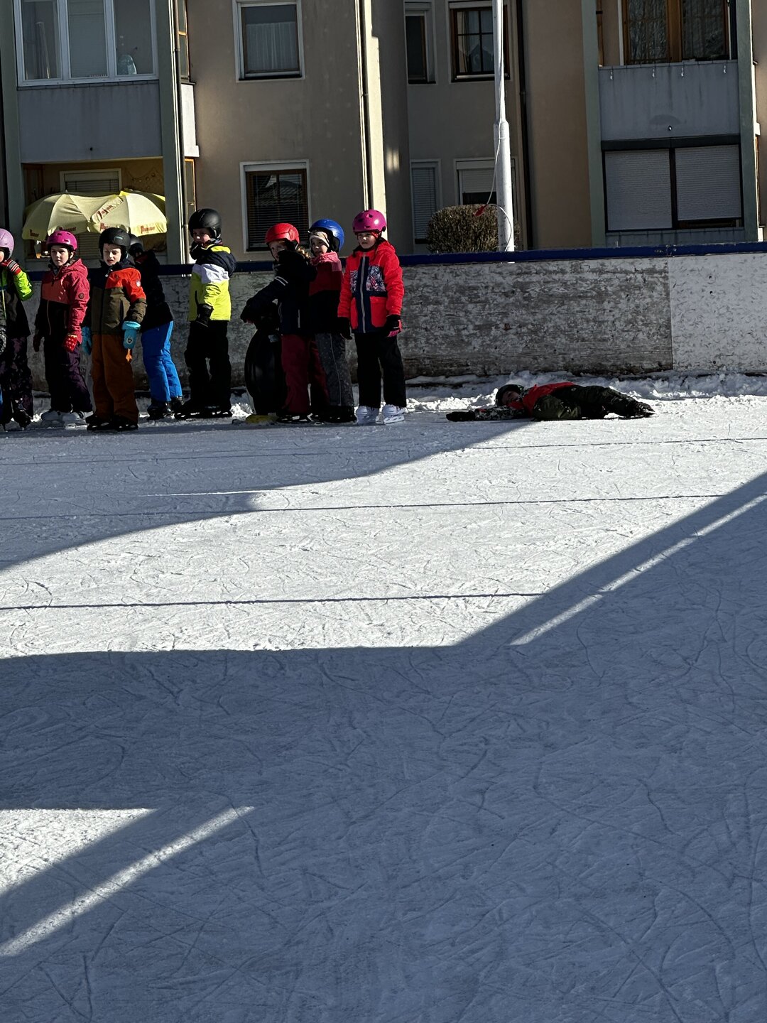Am 25. Jänner hatte die 1b das Vergnügen, mit zwei Trainern eislaufen zu dürfen. Wir übten das Bremsen, das Schlangenfahren und wie man hintereinander fährt. Das war sichtlich anstrengend, daher brauchten wir auch mal eine kurze Pause liegend am Eis.