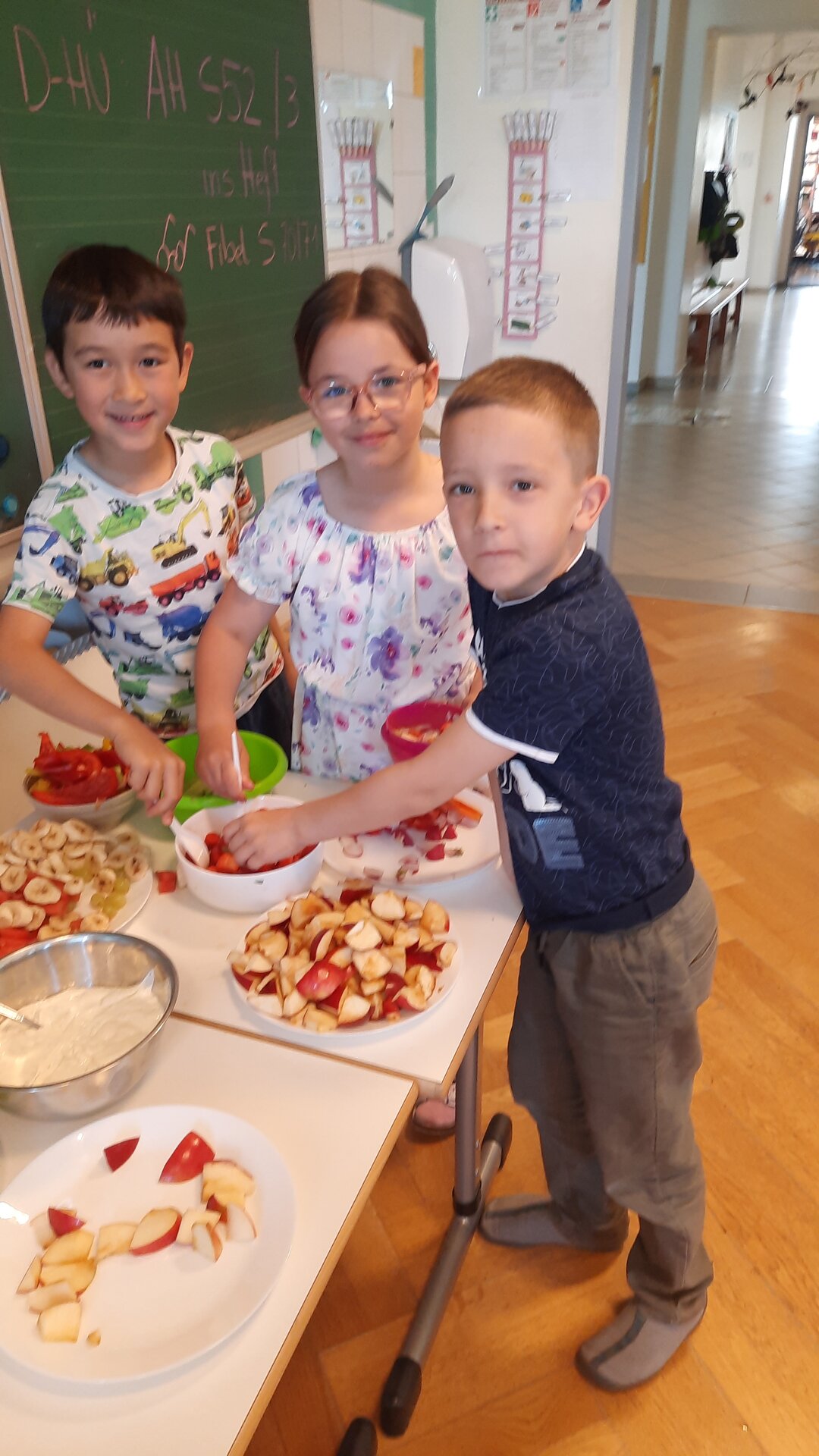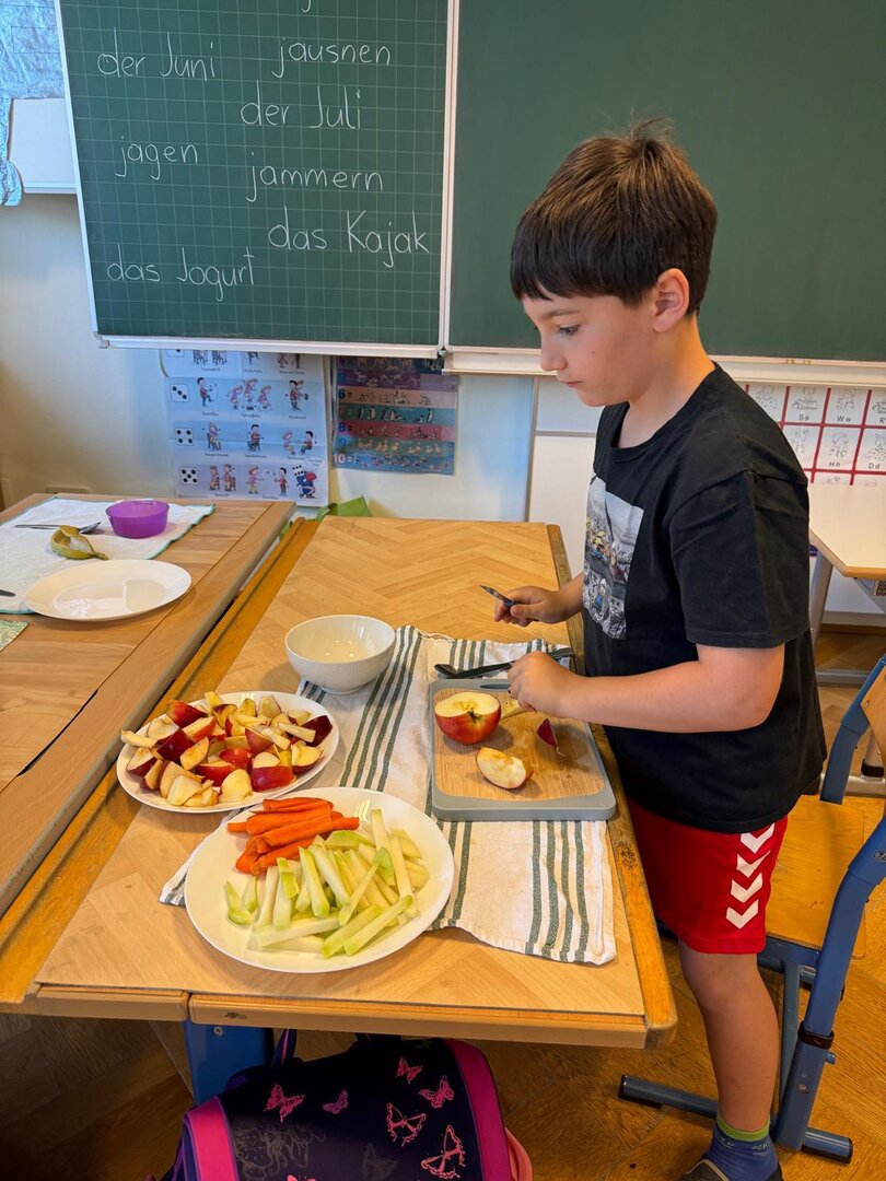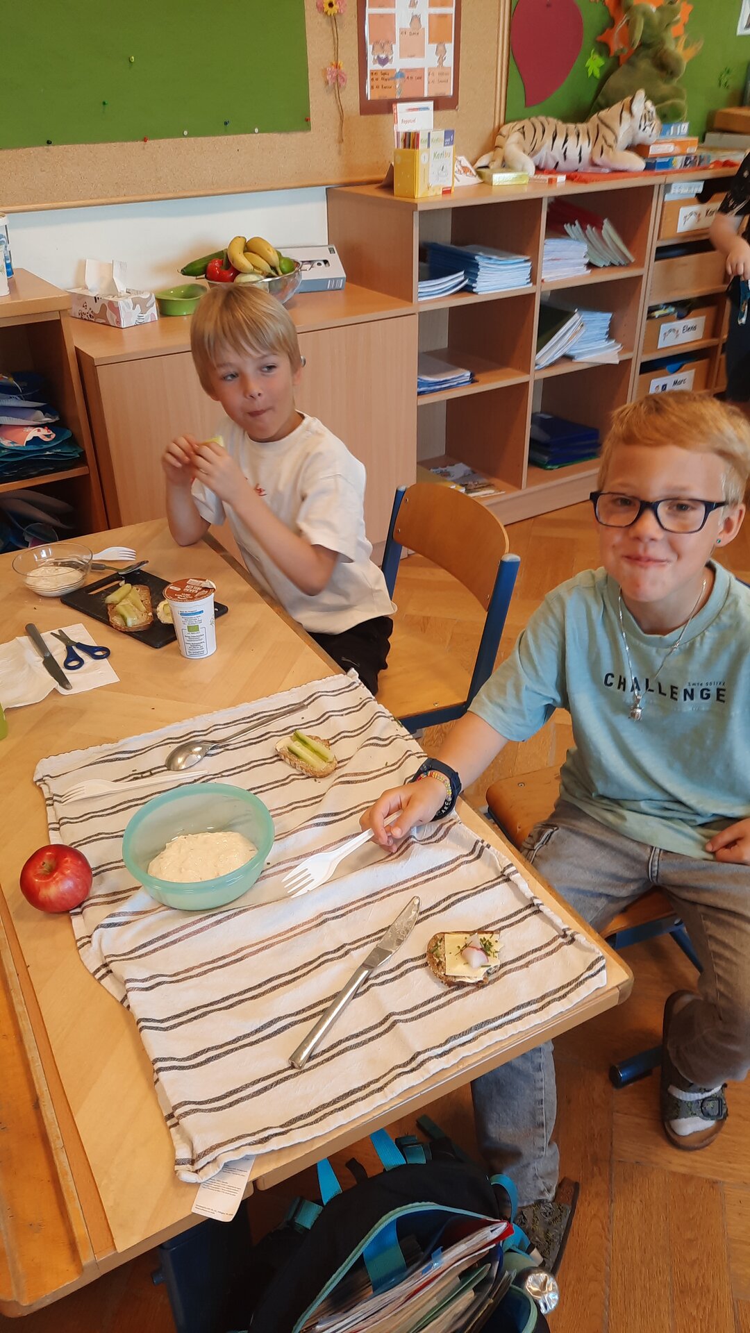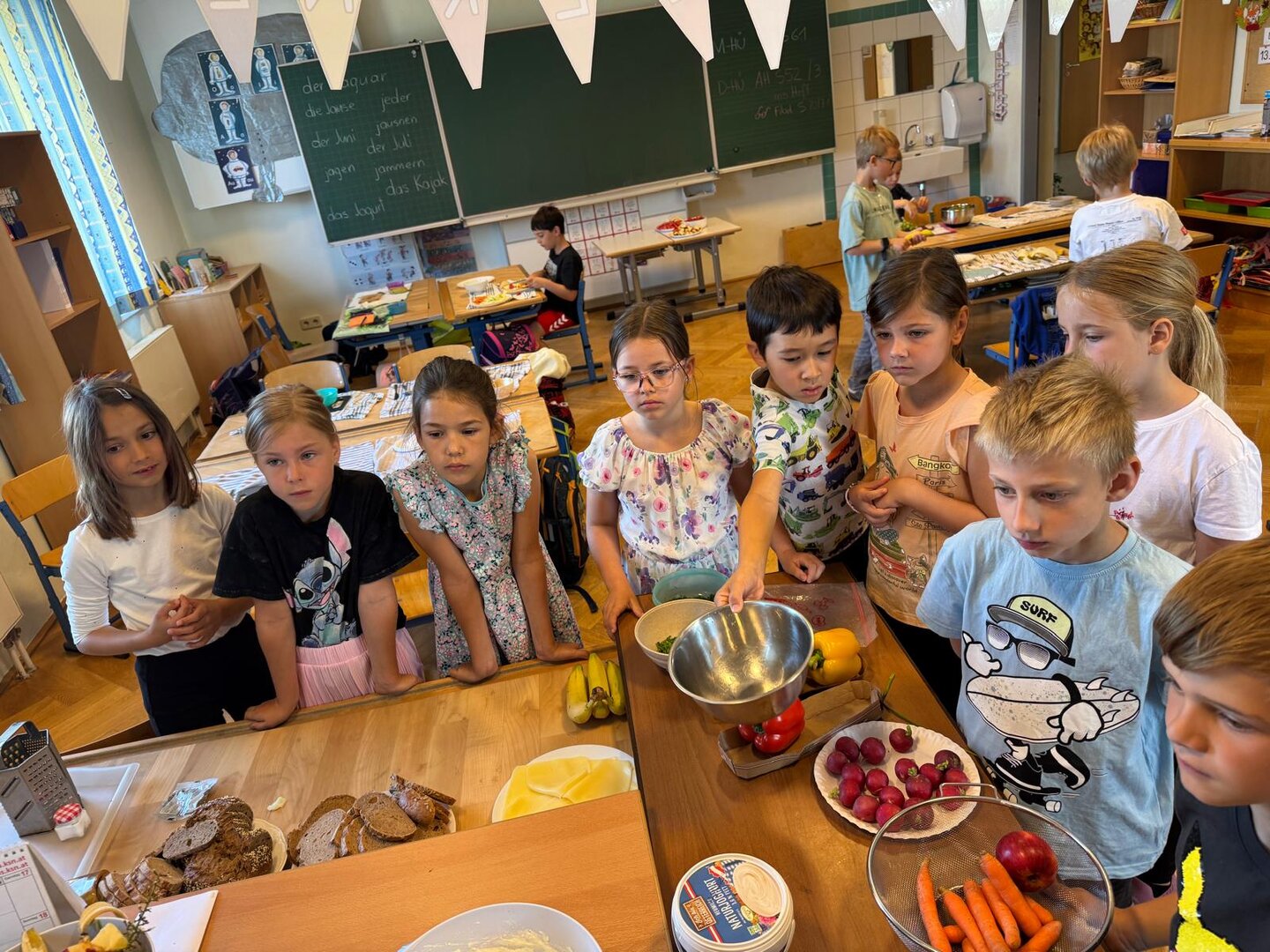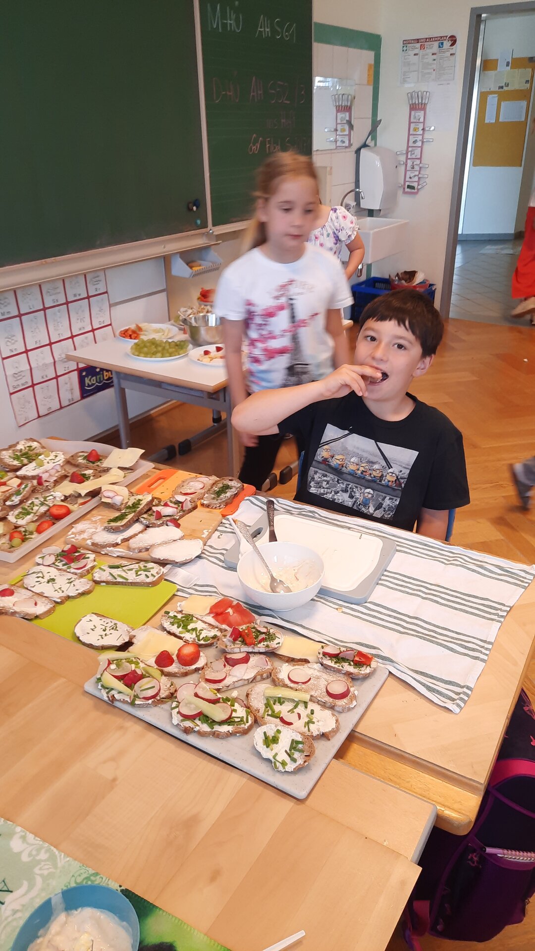 Lebensmittel kennen lernen, Sachwissen über gesunde Nähr- und Inhaltsstoffe erfahren, war das Thema im Sachunterricht. Nun ging`s auch an die praktische Arbeit. Mit riesigem Elan und großer Freude bereiteten sich die Kinder, in verschiedenen Stationen, diese Woche, ihre eigene gesunde Jause. Es wurde "geschnipselt", geschnitten, gerührt, und gestrichen, bis das bunte Buffet fertig war. Die Kinder genossen die selbst bereiteten Speisen und griffen kräftig zu. Es war eine Freude, sie beim genüsslichen Verzehr zu sehen! GESUND idt GUT!