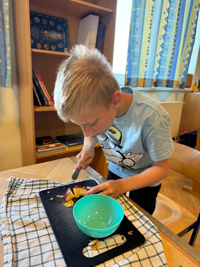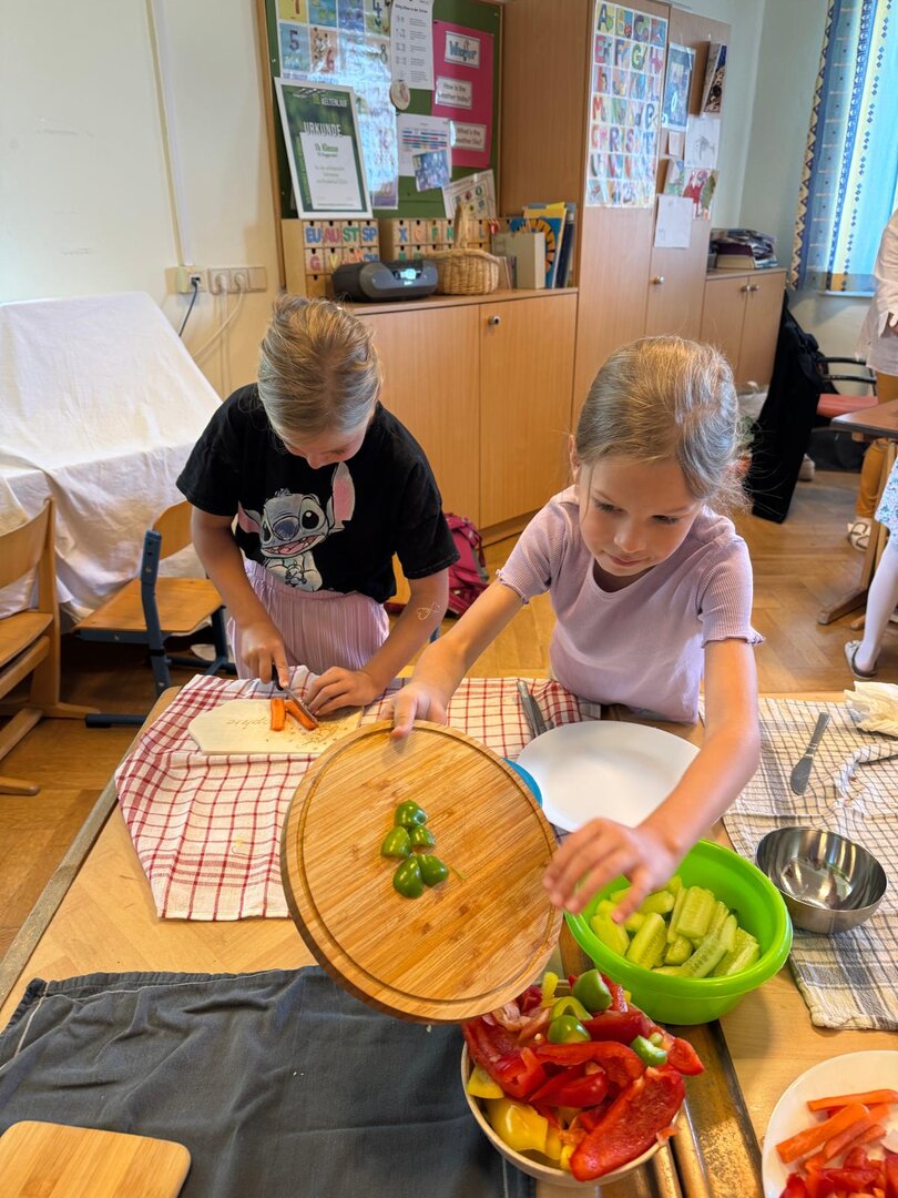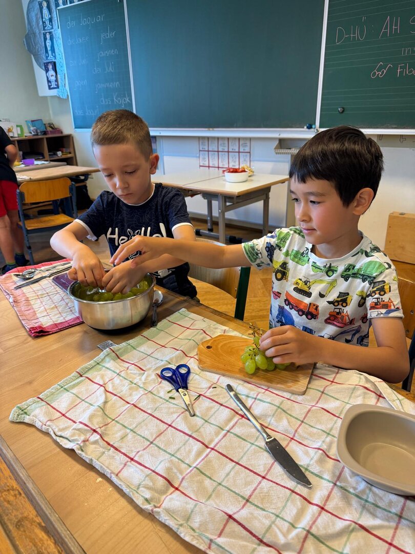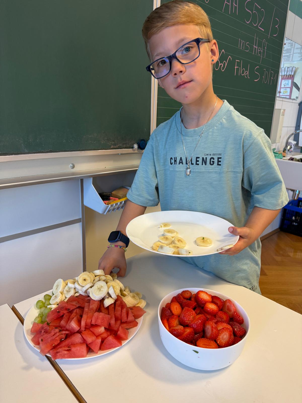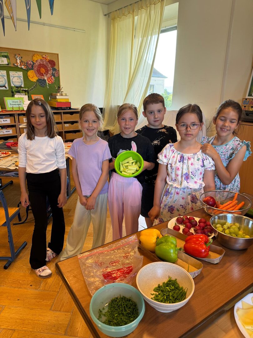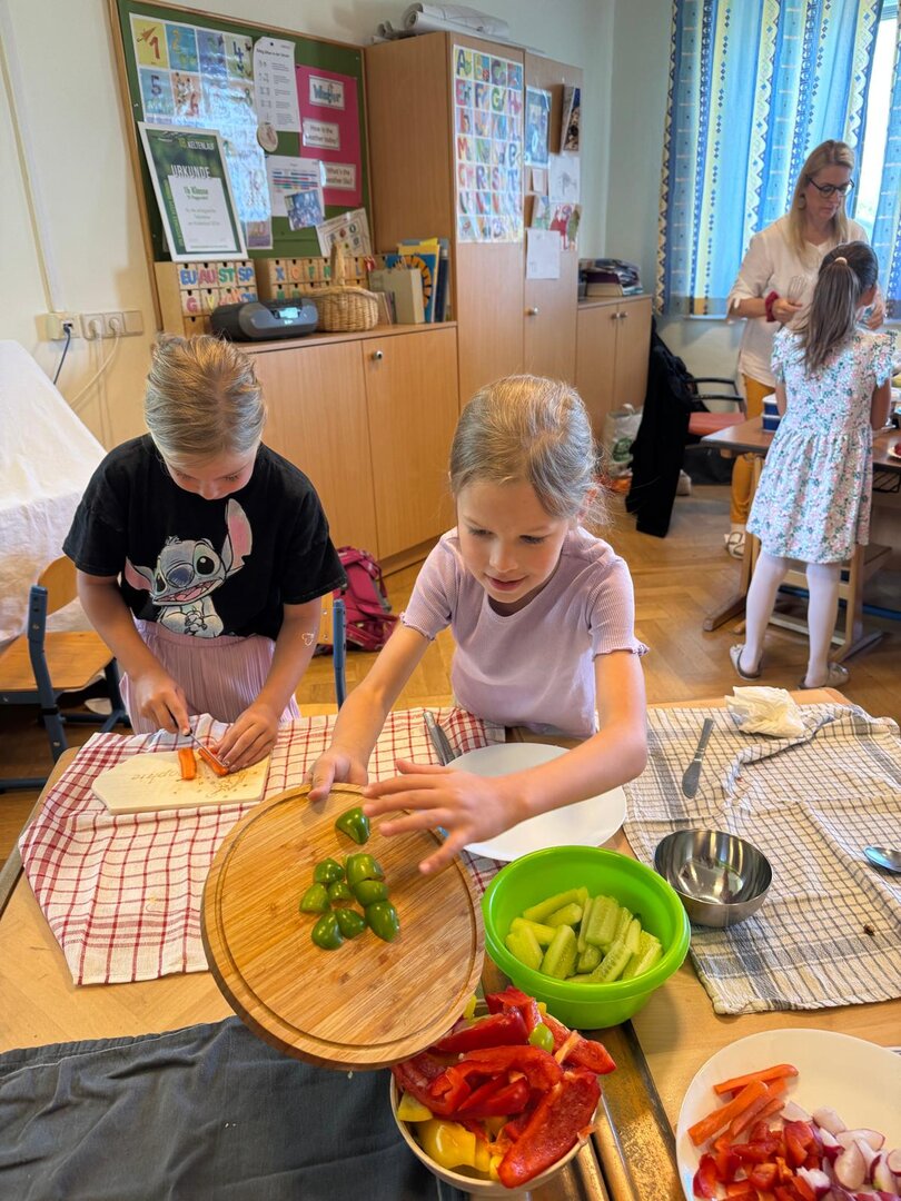 Lebensmittel kennen lernen, Sachwissen über gesunde Nähr- und Inhaltsstoffe erfahren, war das Thema im Sachunterricht. Nun ging`s auch an die praktische Arbeit. Mit riesigem Elan und großer Freude bereiteten sich die Kinder, in verschiedenen Stationen, diese Woche, ihre eigene gesunde Jause. Es wurde "geschnipselt", geschnitten, gerührt, und gestrichen, bis das bunte Buffet fertig war. Die Kinder genossen die selbst bereiteten Speisen und griffen kräftig zu. Es war eine Freude, sie beim genüsslichen Verzehr zu sehen! GESUND idt GUT!