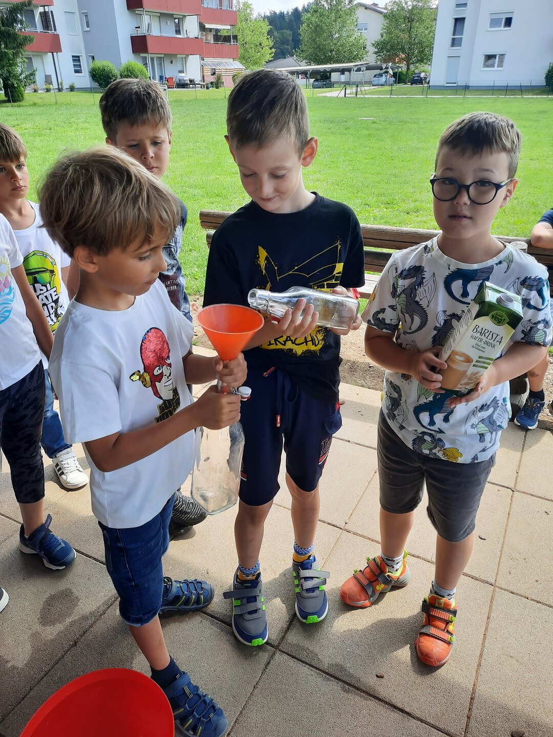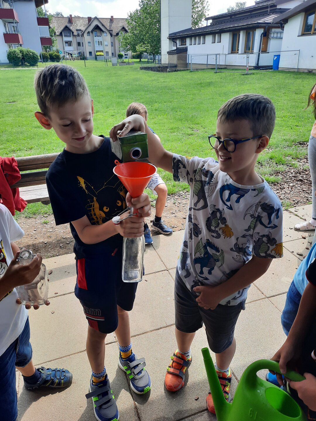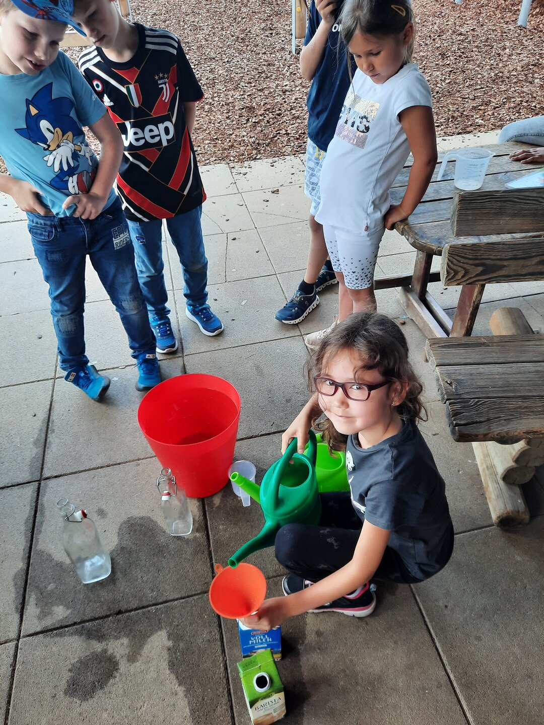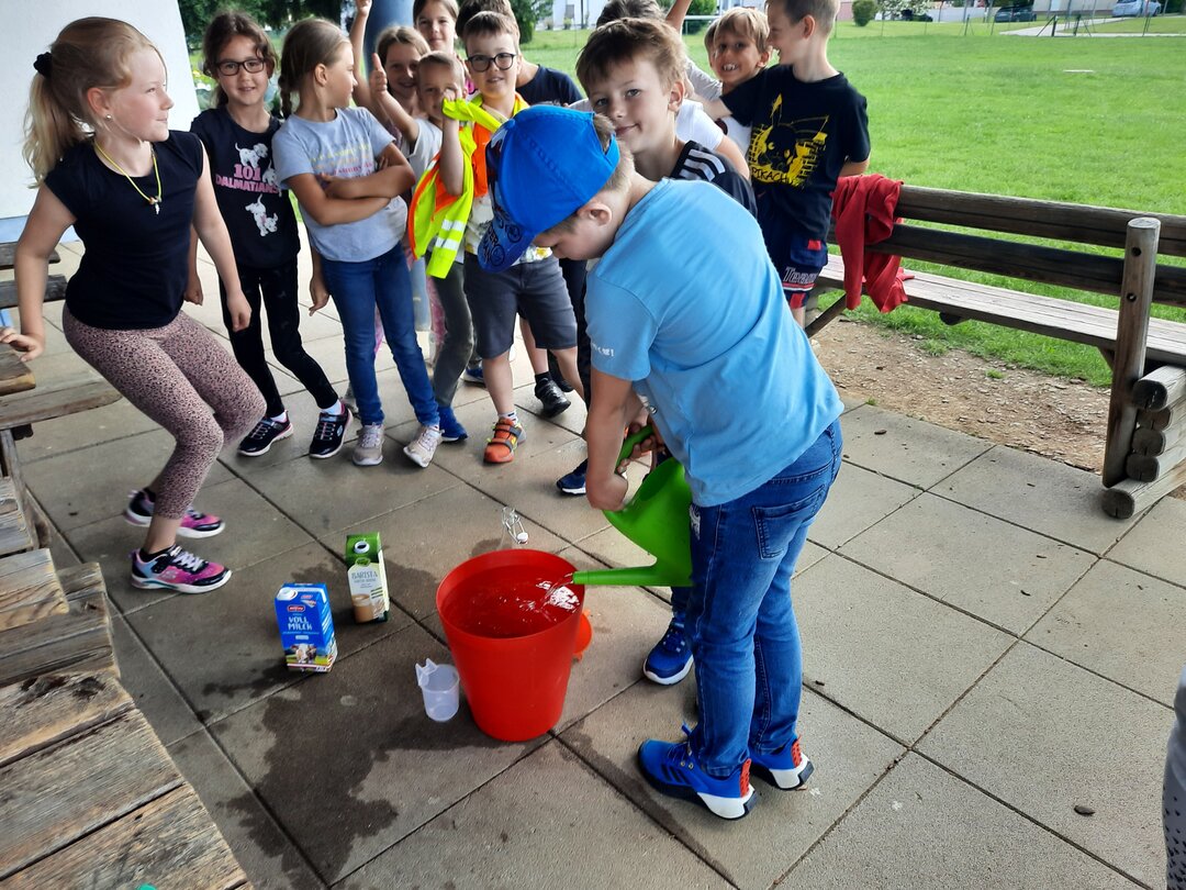 Heute erforschten wir die Maßeinheit Liter im Freien. Was und wie viel ist ein Liter?, wie viel Flüssigkeit passt wo hinein? etc.... Viele Fragen konnten wir durch schätzen und vergleichen bzw. messen letztlich beantworten. Das war nicht so einfach, aber sehr spannend - Mathematik erforschen und handelnd erfahren war "cool" und wir haben uns ganz viel gemerkt!