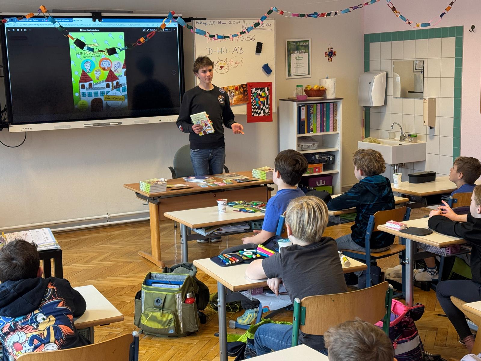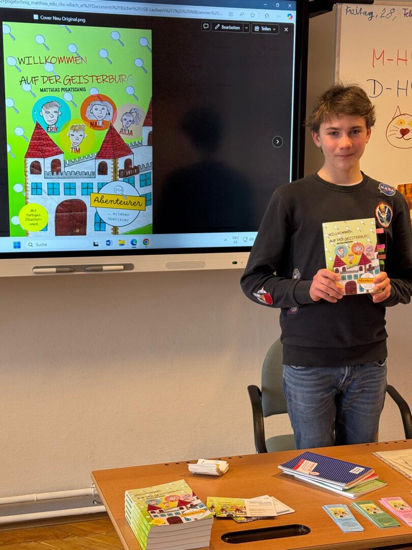 Der Jungautor Matthias Pogatschnig besuchte die 3. Klassen zu einer erfrischenden Lesung mit Jause und Zeichenworkshop. Für die Kinder las er aus seinem Buch "Willkommen auf der Geisterburg". Was für ein Vorbild!