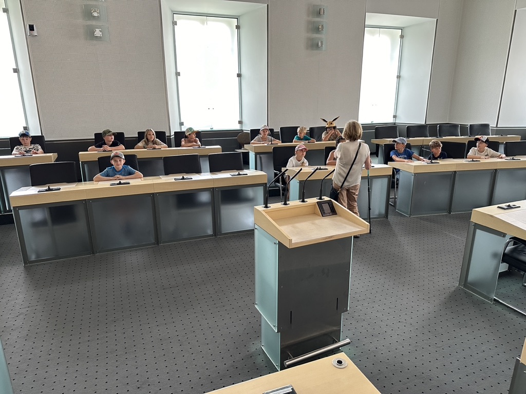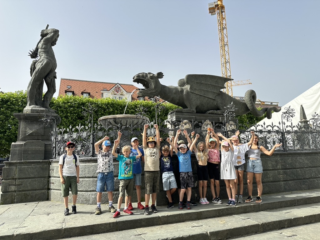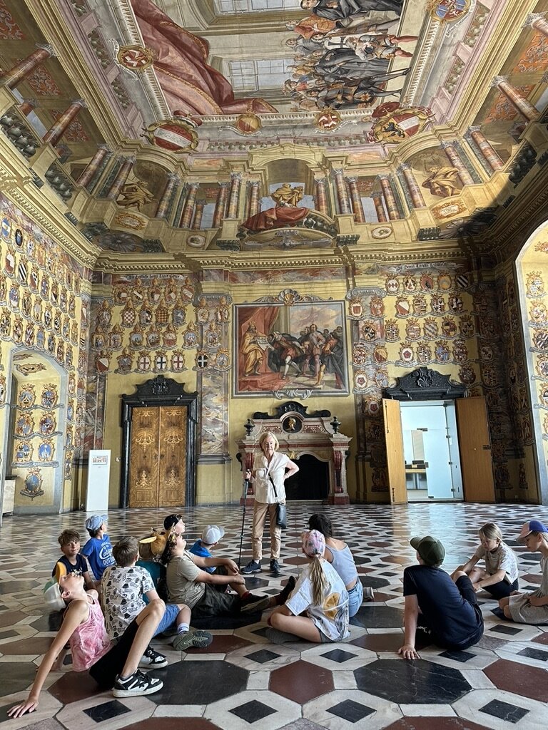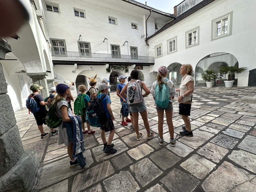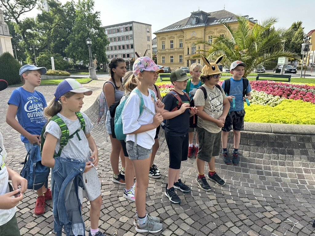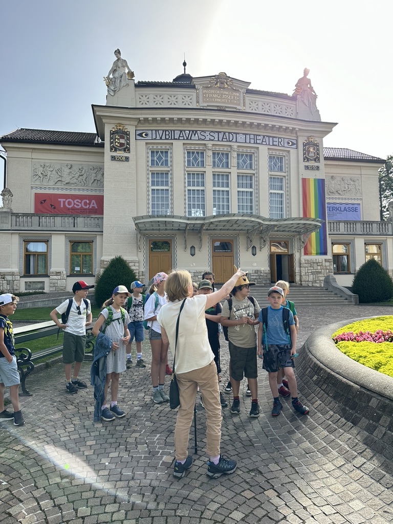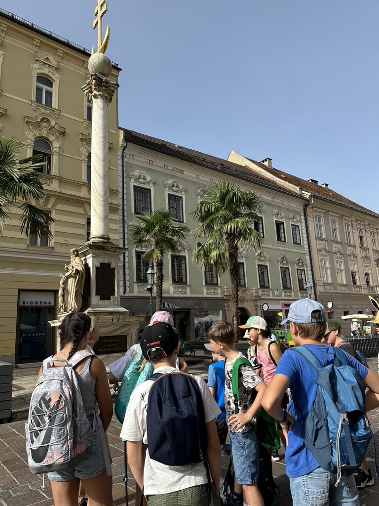 Bei der Stadtführung durch Klagenfurt starteten die Kinder der 4a beim Stadttheater, dann ging es weiter über den Alten Platz, durch schmale Gassen und Innenhöfe zum Neuen Platz. Zum Schluss durften sie auch noch über den Wappensaal im Landtag Platz nehmen.