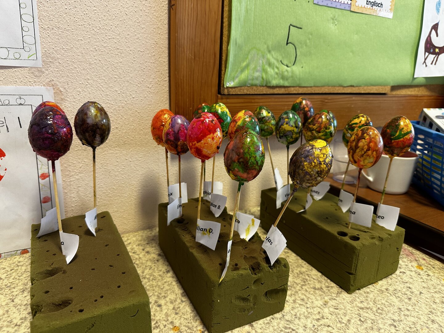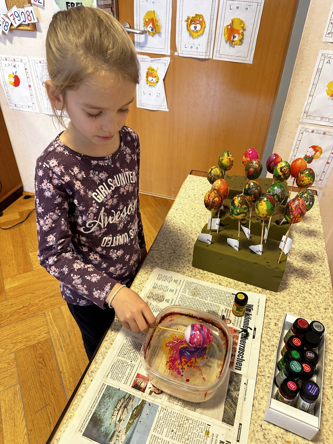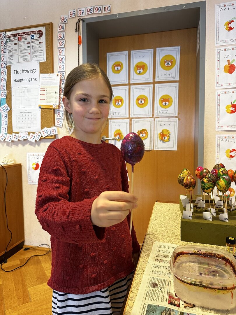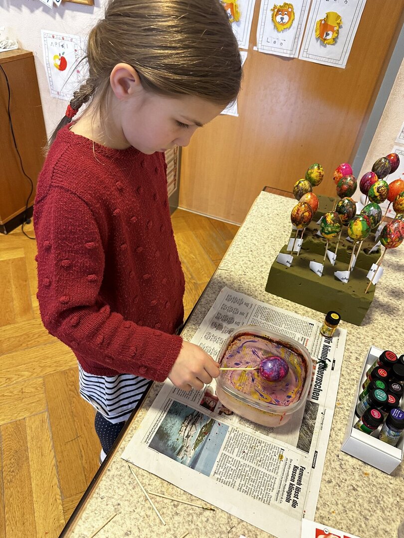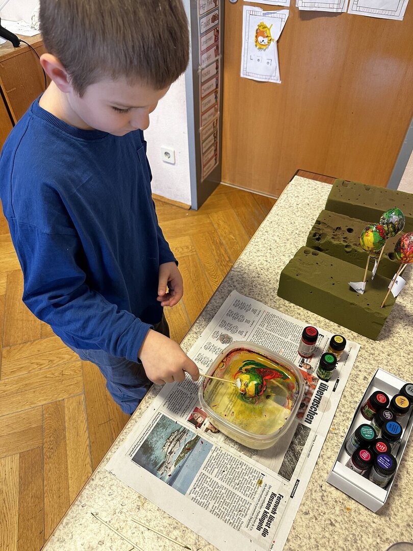 Dazu durfte jedes Kind sein Osterei mit den Farben marmorieren, die es sich ausgesucht hatte. Die SchülerInnen hatten viel Spaß und das Ergebnis kann sich sehen lassen!