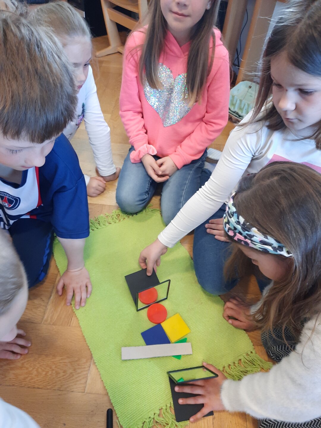 Mit verschiedenen Materialien, Spiegeln, Papier... werden wichtige Begriffe der Geometrie erarbeitet und handelnd erfahren.