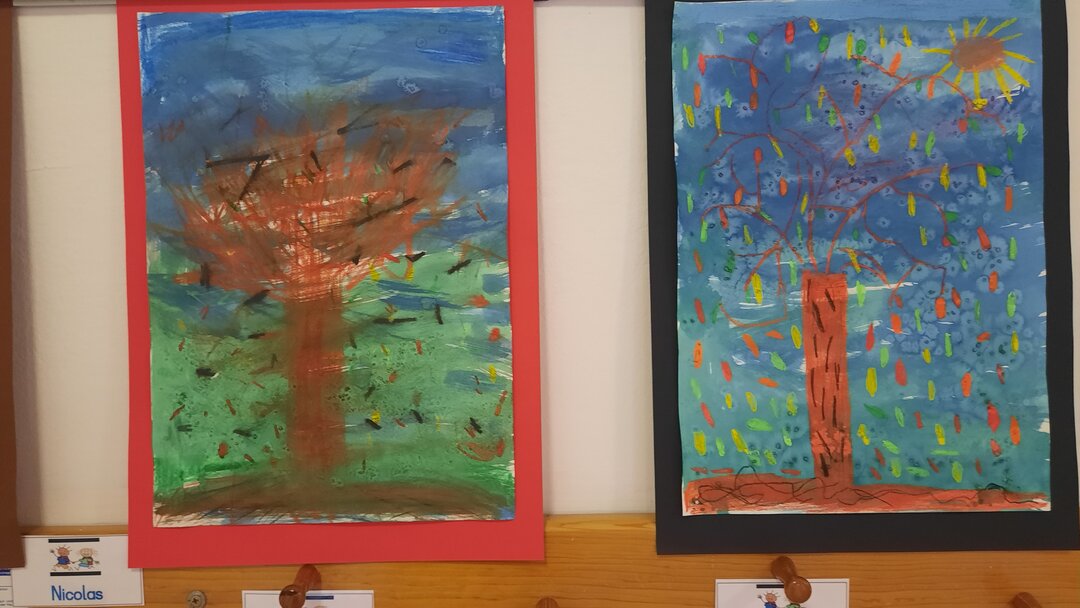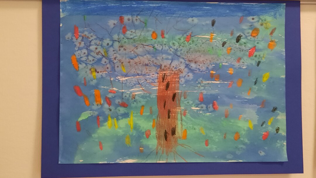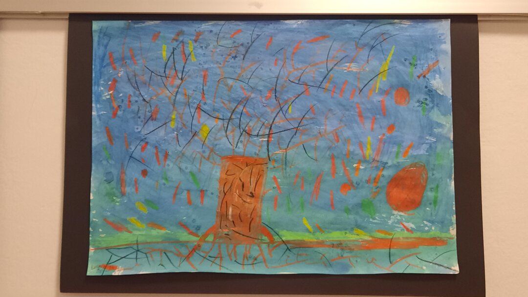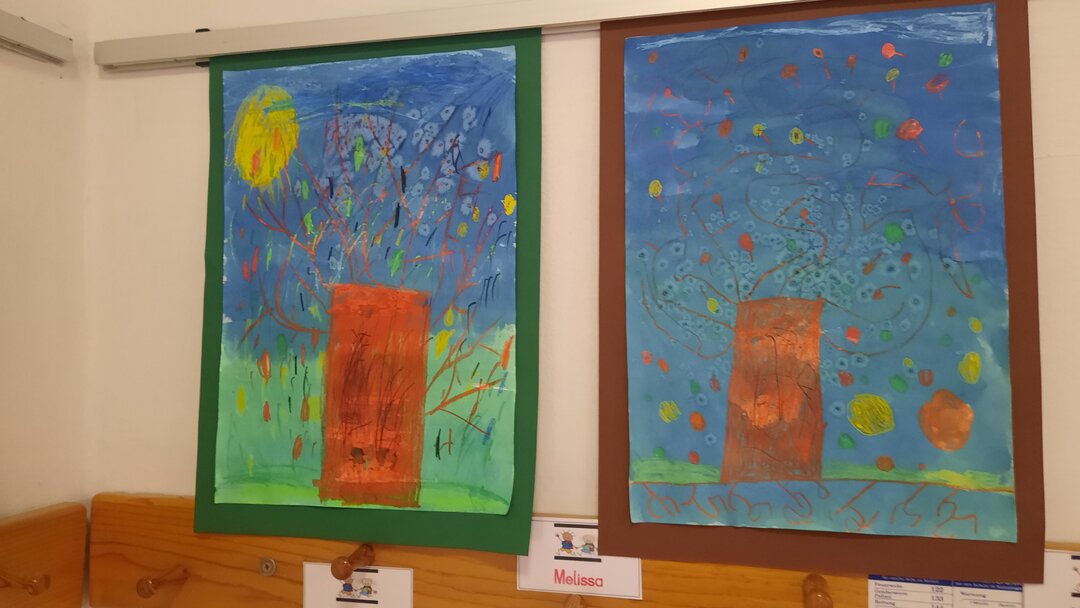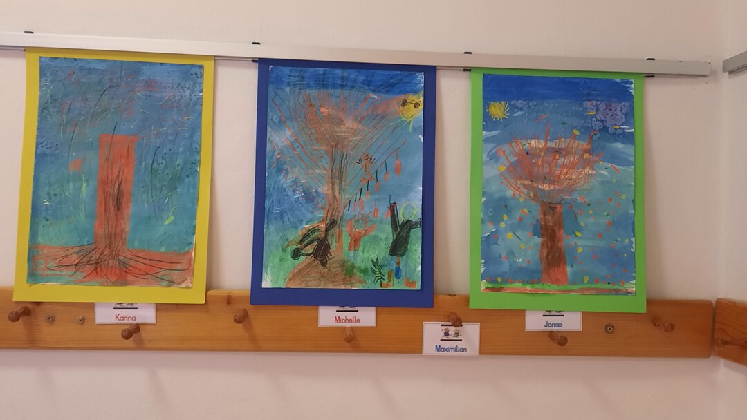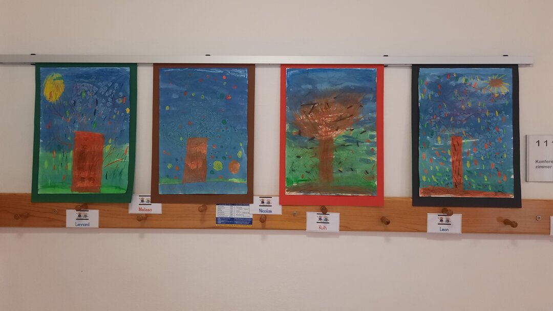 Mit Ölkreide und "Zauberfarbe" und einigen Tricks zauberten wir stimmungsvolle Herbstbäume auf das Papier. Ob Sturm, Sonne oder buntes Laub - die Herbststimmung ist perfekt gelungen. Wir sind stolz auf unsere ersten ausgestellten Werke!